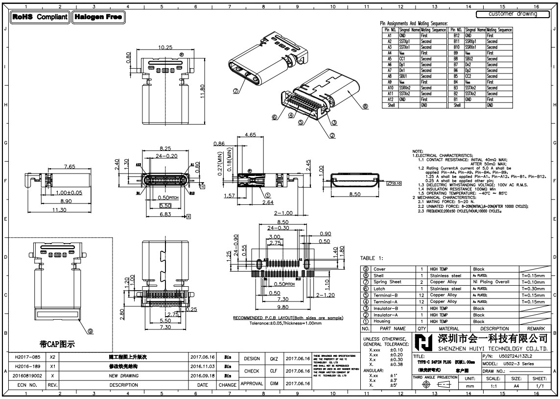 TYPE-C 24PIN公头 沉板1.0 双排SMT式点击次数:2272